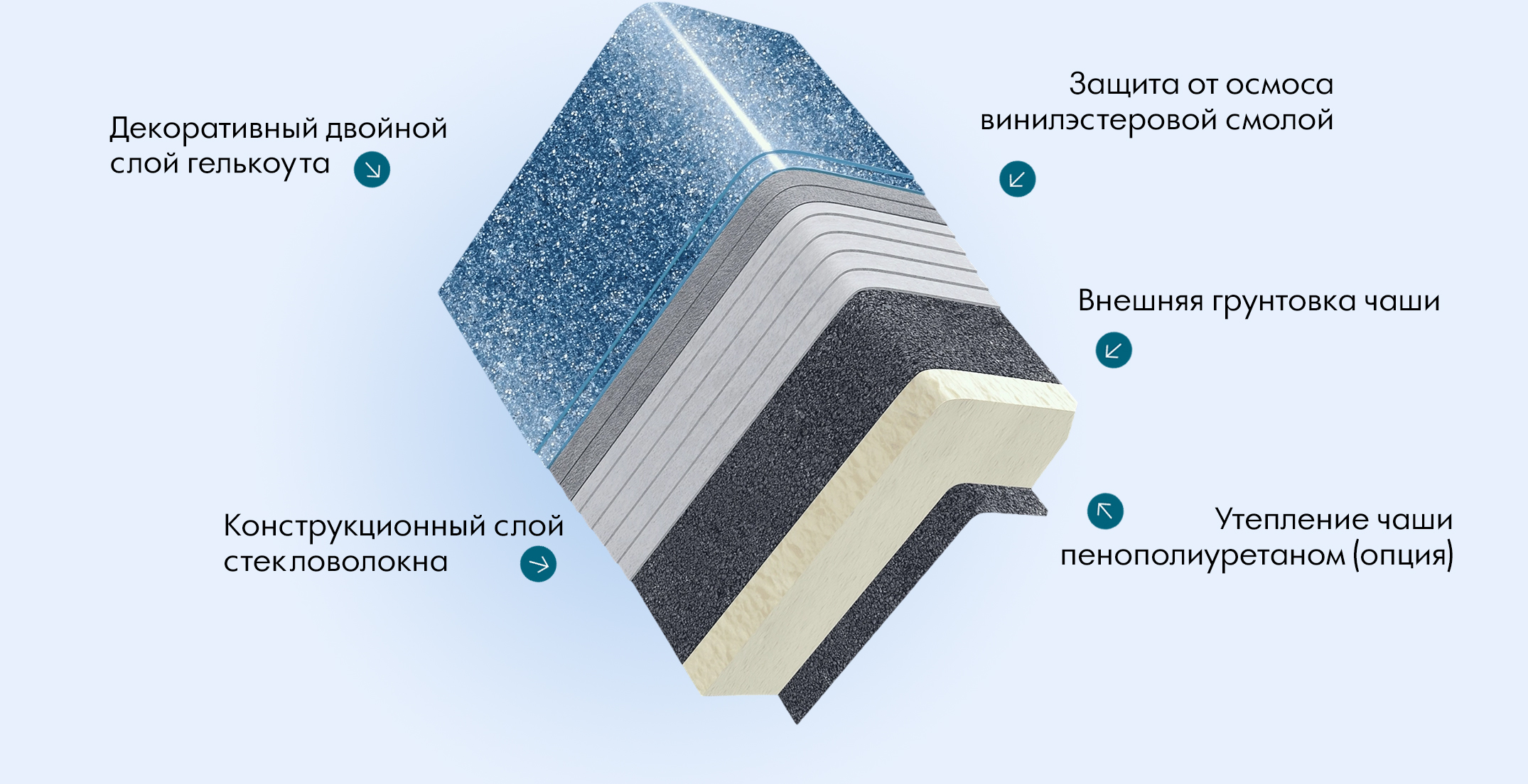 Дополнительные ребра жесткости на стены бассейна из композита придают жесткости и сохраняют геометрию чаши бассейна при подвижности грунта (актуально для прямоугольных форм бассейнов).